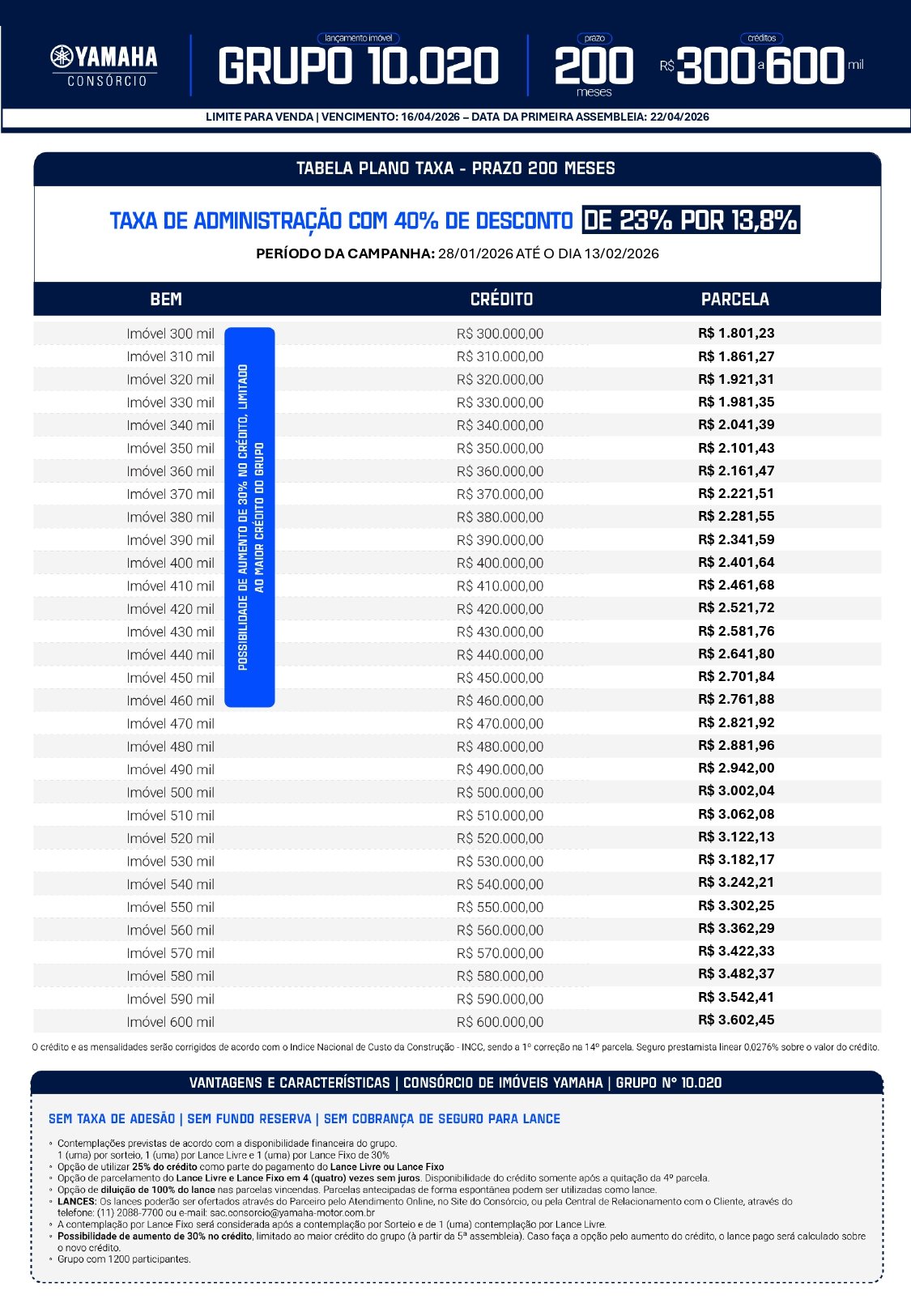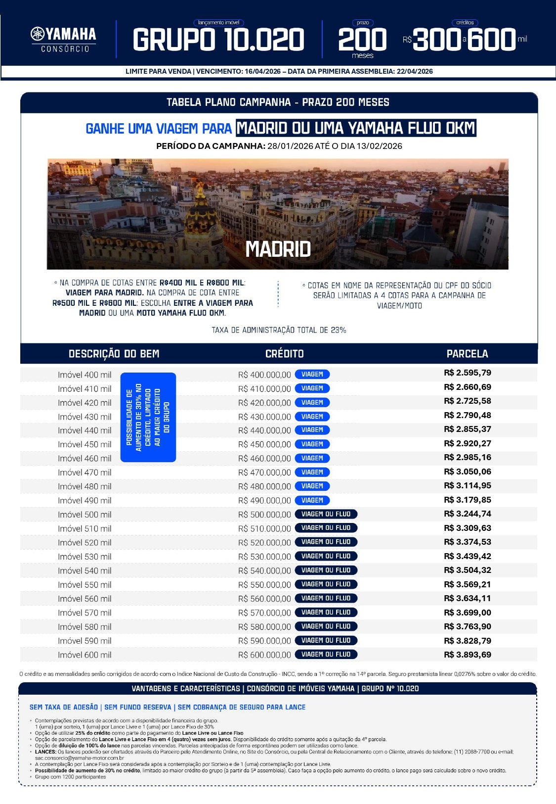 São condições imperdíveis para você adquirir sua cota de consórcio ainda hoje. Você GANHA, (não é concurso, é prêmio) uma viagem para Madri, na Espanha ou uma Yamaha Fluo 0Km.